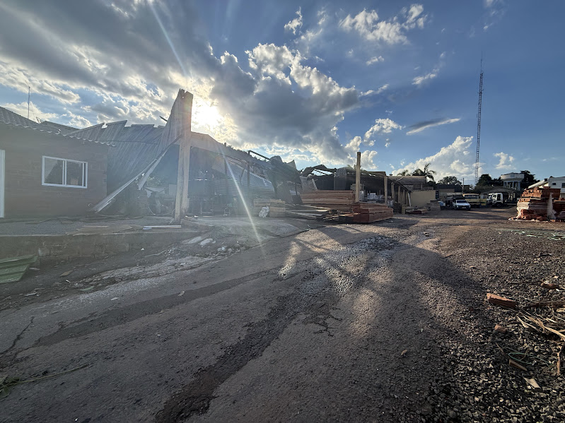 Forte vento causa destelhamentos e derruba estrutura de depósito em Bom Retiro do Sul
