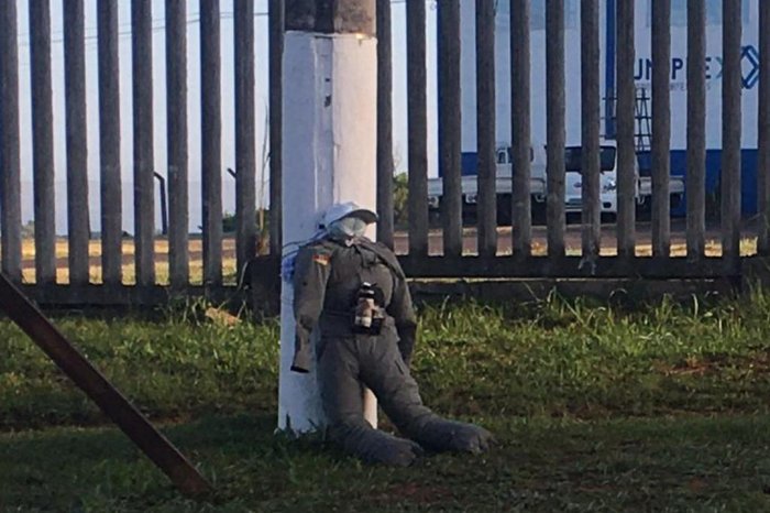 O manequim foi amarrado em um poste no Distrito Industrial de Alvorada. O boneco não continha nenhuma inscrição, estava com um boné e, junto ao corpo, o artefato preso com fitas.