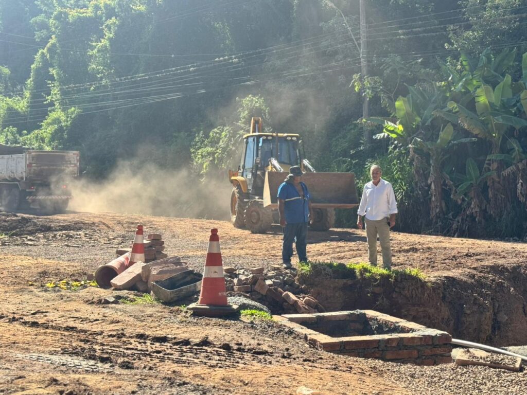 Prefeito Celso Pazuch acompanhou a finalização da obra. Nova canalização visa impedir novas rachaduras. (Foto: Ascom/Bom Retiro do Sul)